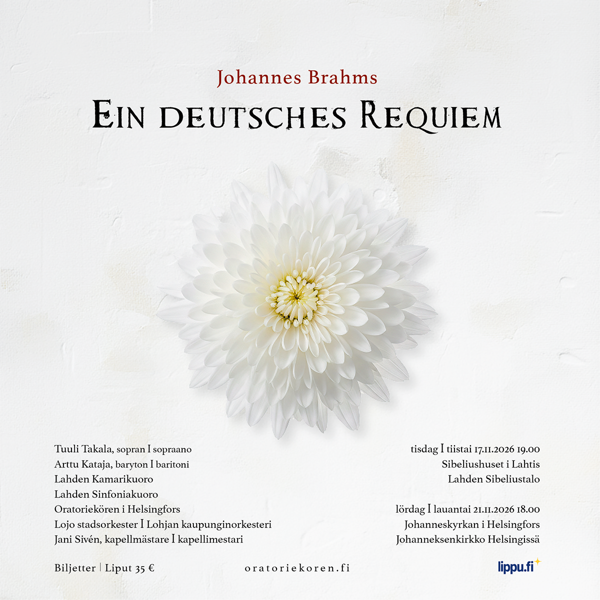 Oratoriekören i Helsingfors esittää Johannes Brahmsin ikonisen suurteoksen Ein deutsches Requiem marraskuussa 2026. Produktio toteutetaan yhteistyössä Lahden Kamarikuoron ja Lahden Sinfoniakuoron kanssa.